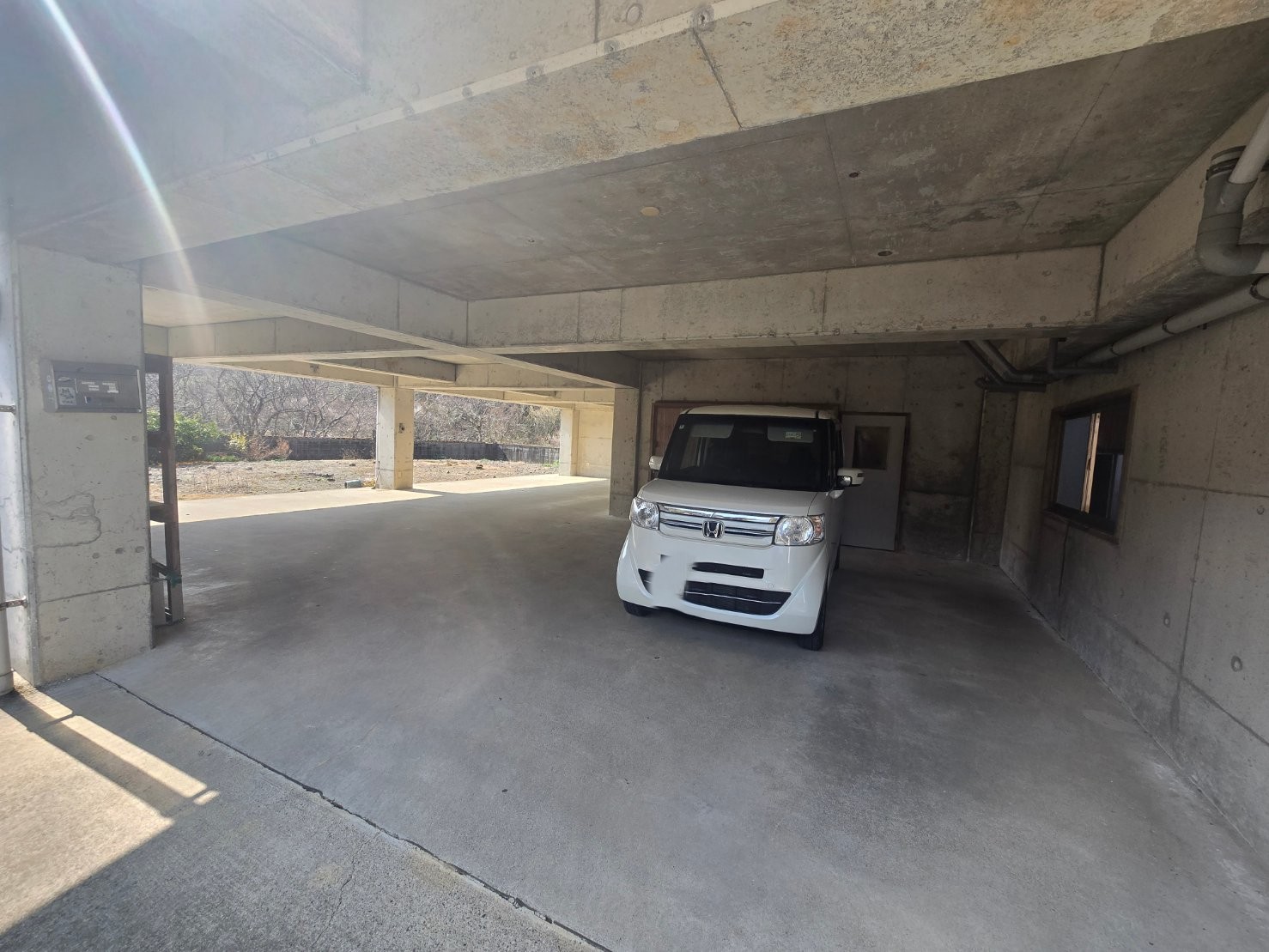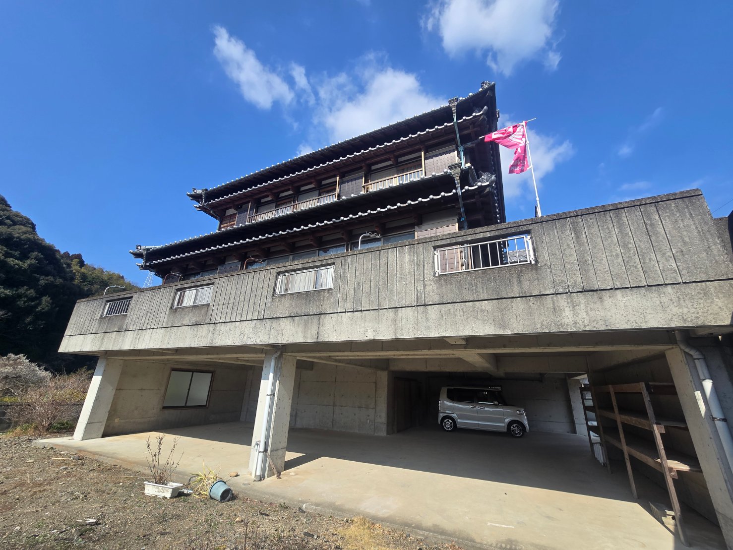高床式の2階建て住宅です。1階は駐車場として利用でき、複数台駐車可能です。庭も広く、日当たりも良い住宅です。
